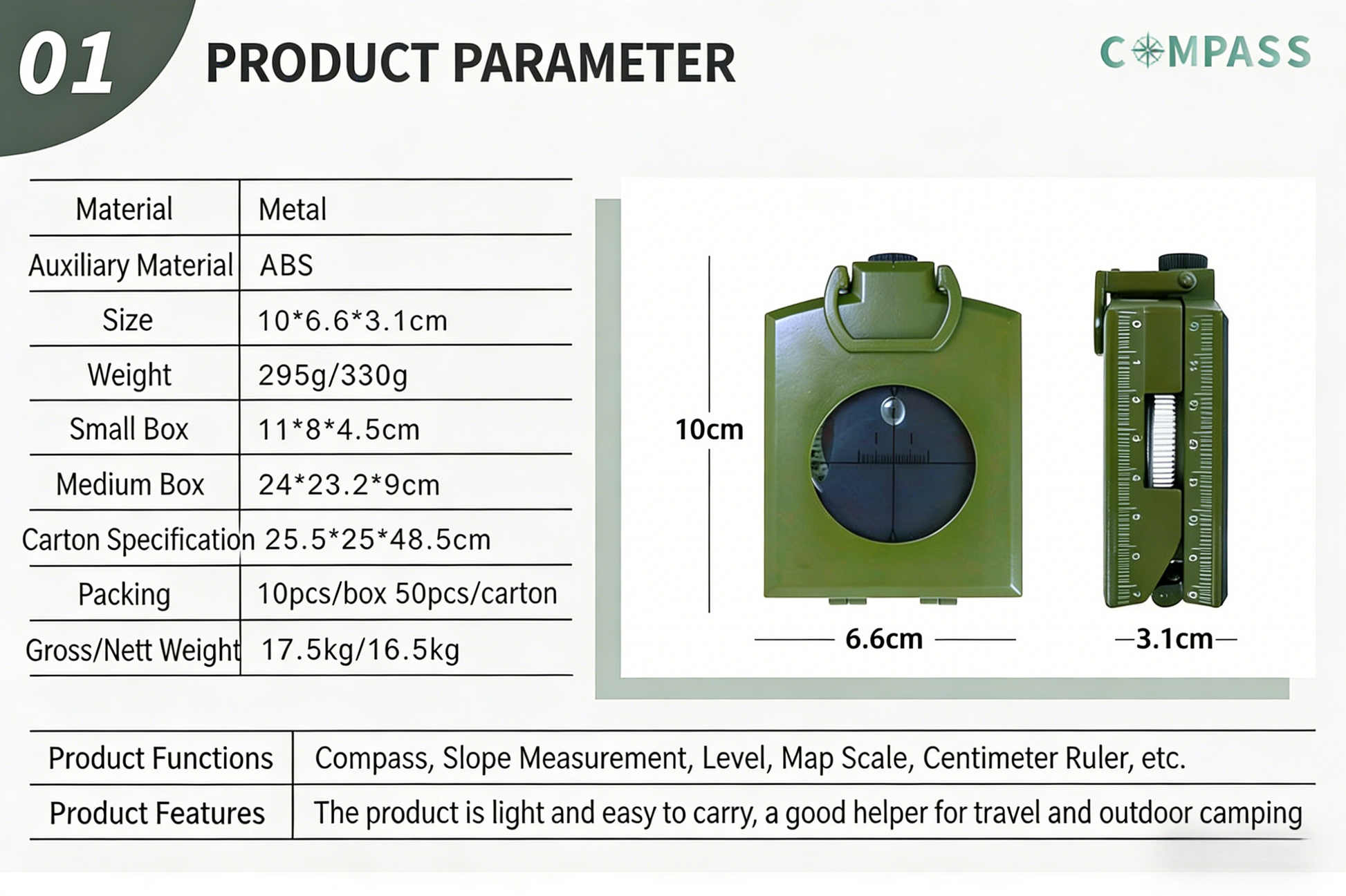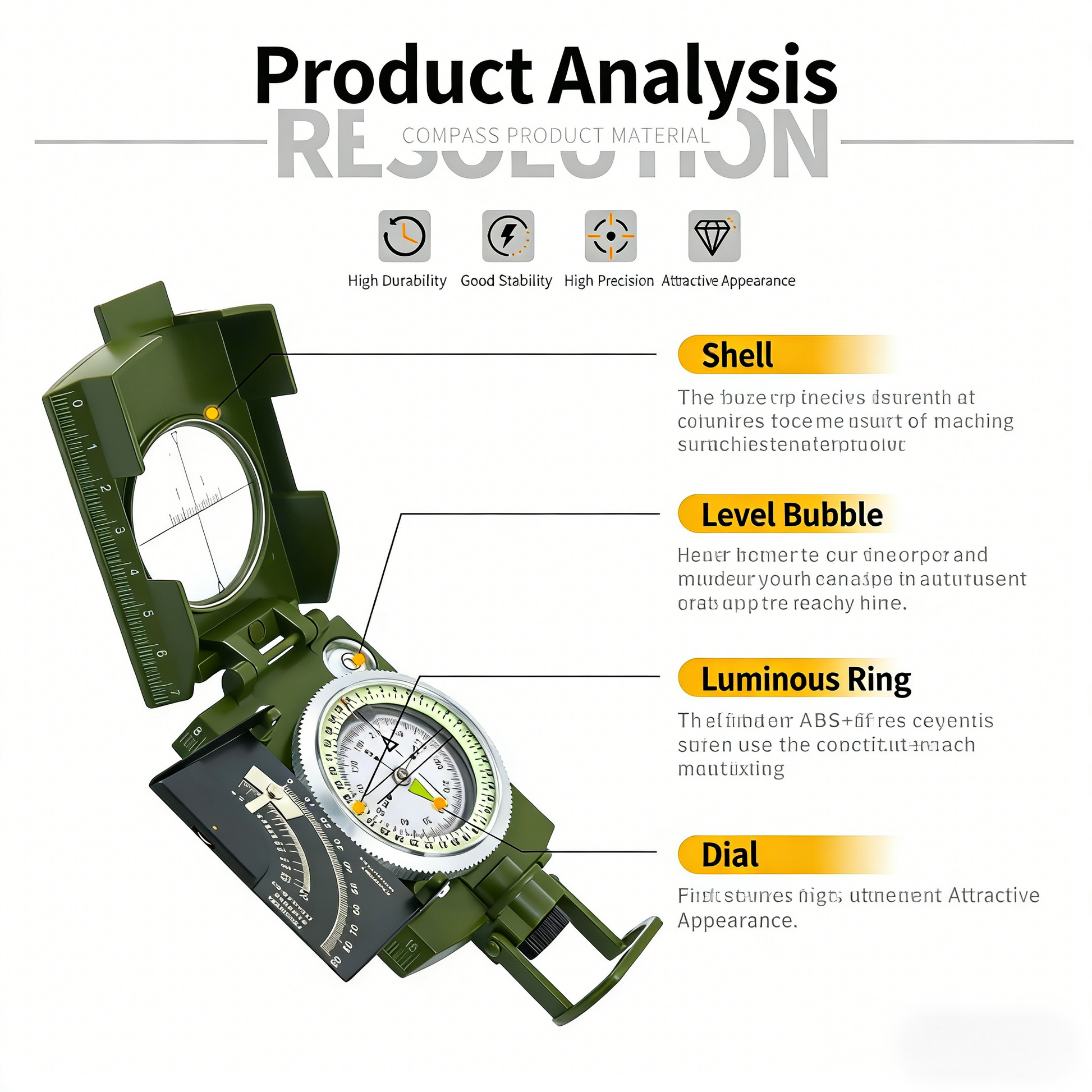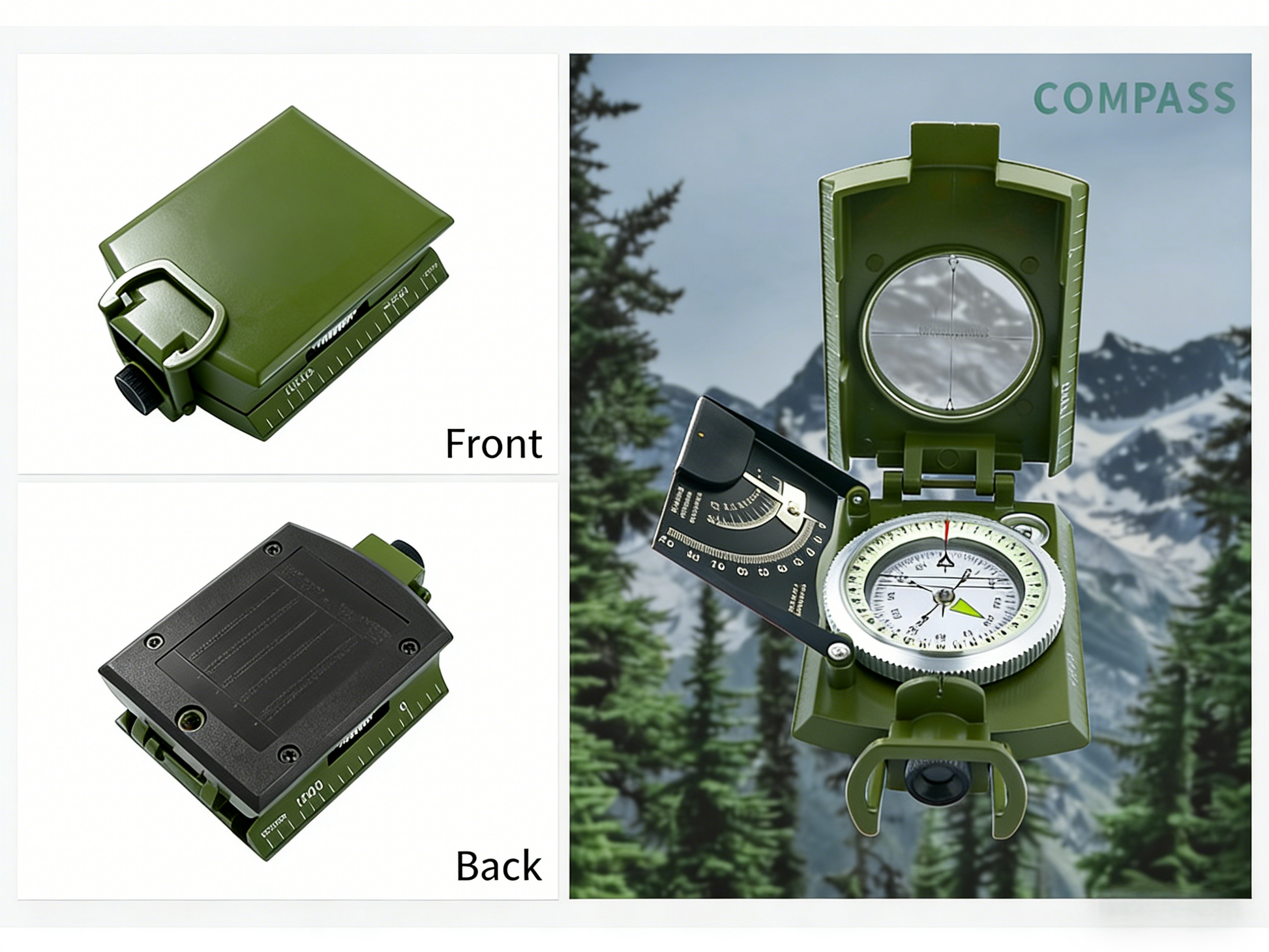 Dieser Kompass ist aus robustem Metall gefertigt , in klassischem Militärgrün gehalten und verfügt über ein Linsenvisier , im Dunkeln leuchtende Markierungen sowie Mehrwinkelmessinstrumente für eine präzise Navigation bei Tag und Nacht.