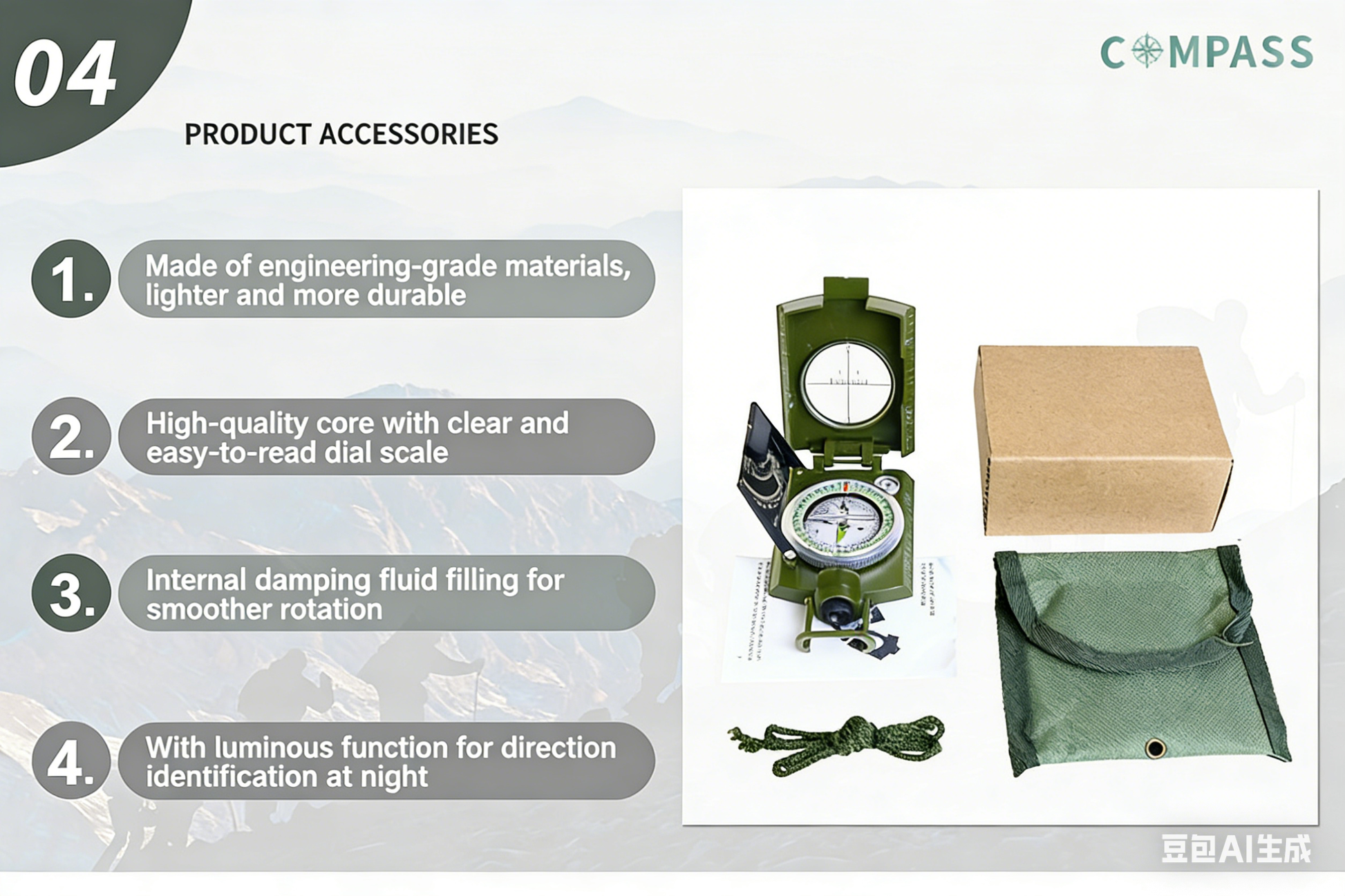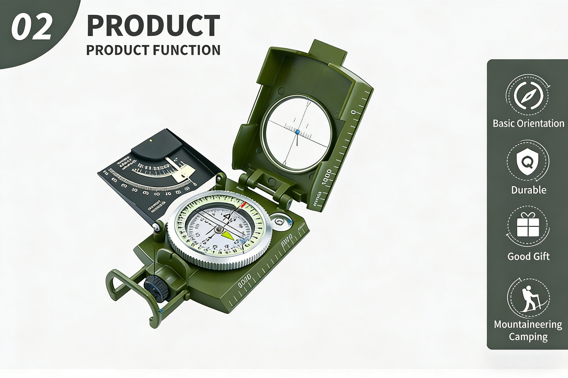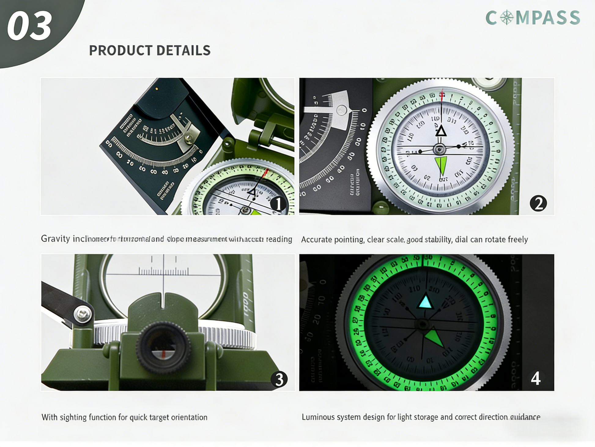 Dieser Kompass ist aus robustem Metall gefertigt , in klassischem Militärgrün gehalten und verfügt über ein Linsenvisier , im Dunkeln leuchtende Markierungen sowie Mehrwinkelmessinstrumente für eine präzise Navigation bei Tag und Nacht.